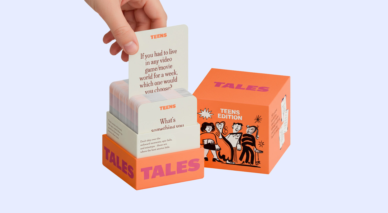 Whether it’s dinner, a holiday, or just a quiet night in, Tales helps your family talk, laugh, and bond the old-fashioned way.